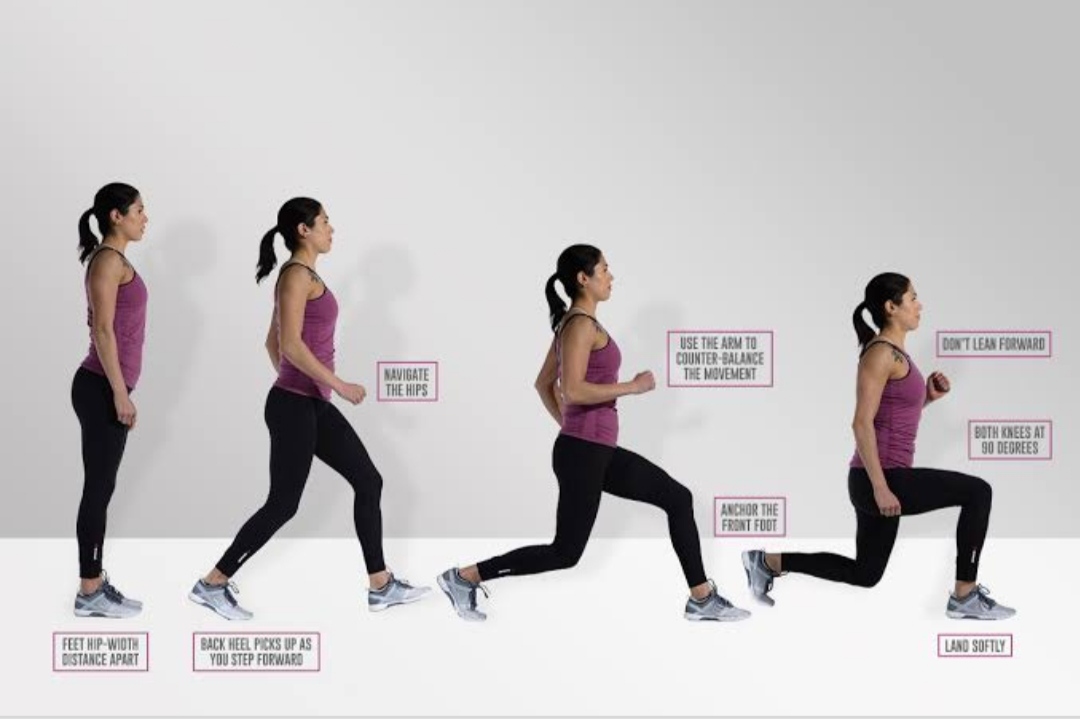 6) Lunges – A lunge can refer to any position of the human body where one leg is positioned forward with knee bent and foot flat on the ground while the other leg is positioned behind.You can lunge when you walk to the kitchen, you can lunge to the driveway as you get the paper in the morning and you can even lunge when you walk from your desk to the water cooler at work.